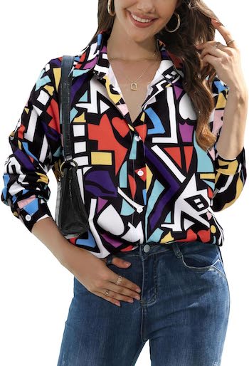 There are so many lines and things going on in that pattern that people won’t notice you are sweating like crazy underneath. Ensure it’s not too tight so you don’t sweat too much. Also, make sure it includes some black and white lines since these colors won’t show sweat stains as much.